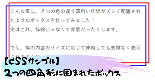 こんな風に、2つの色の違う四角い枠線がズレて配置されたようなボックスを作ってみました!実はこれ、枠線じゃなくて背景だったりします。でも、枠の内容のサイズに応じて伸縮しても支障なく表示されますよ^^ どうも!LSSです!! 実は以前からCSSサンプル…