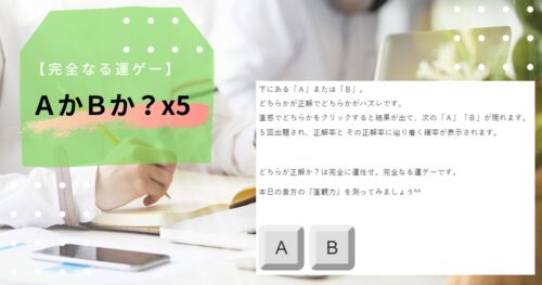 どうも!LSSです!! 今回はブラウザゲーム…なんですが、これをゲームと言っていいのやら、どうなのやらw まったく考える余地のない、「完全なる運ゲー」です。 AかBか?x5 というものを作ってみました AかBか?x5 下にある「A」または「B」。どちら…